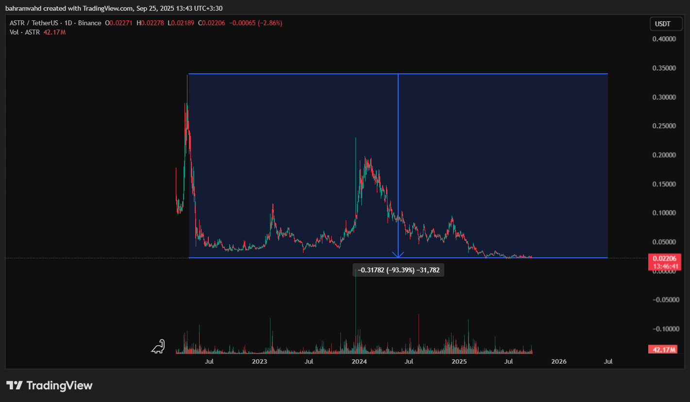 - ATL (کف تاریخی): تقریبا 0.032 دلار (اکتبر ۲۰۲۳) و قیمت فعلی حتی زیر ATL ثبتشده معامله میشود؛ یعنی ASTR اکنون در پایینترین محدودههای تاریخی خود قرار دارد.