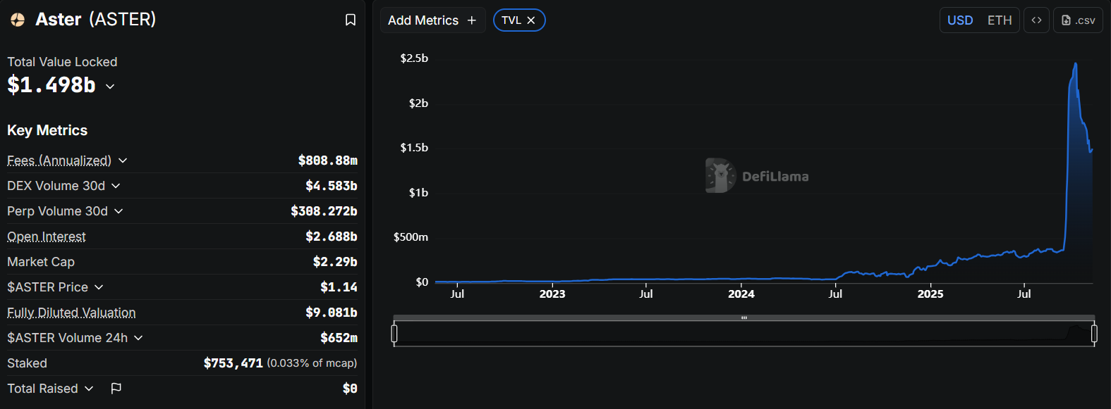 نمودار TVL (Total Value Locked) در پلتفرم Aster نشان می‌دهد که این پروتکل طی مدت کوتاهی رشد قابل توجهی را تجربه کرده است. بر اساس داده‌های DefiLlama، ارزش کل قفل‌شده در Aster در اوج خود به بیش از ۲.۳ میلیارد دلار رسید و در حال حاضر پس از اصلاح بازار، حدود ۱.۴ تا ۱.۵ میلیارد دلار تثبیت شده است. این حجم از TVL برای یک صرافی غیرمتمرکز تازه‌وارد نشان‌دهنده جذب مؤثر نقدینگی و اعتماد اولیه کاربران است.