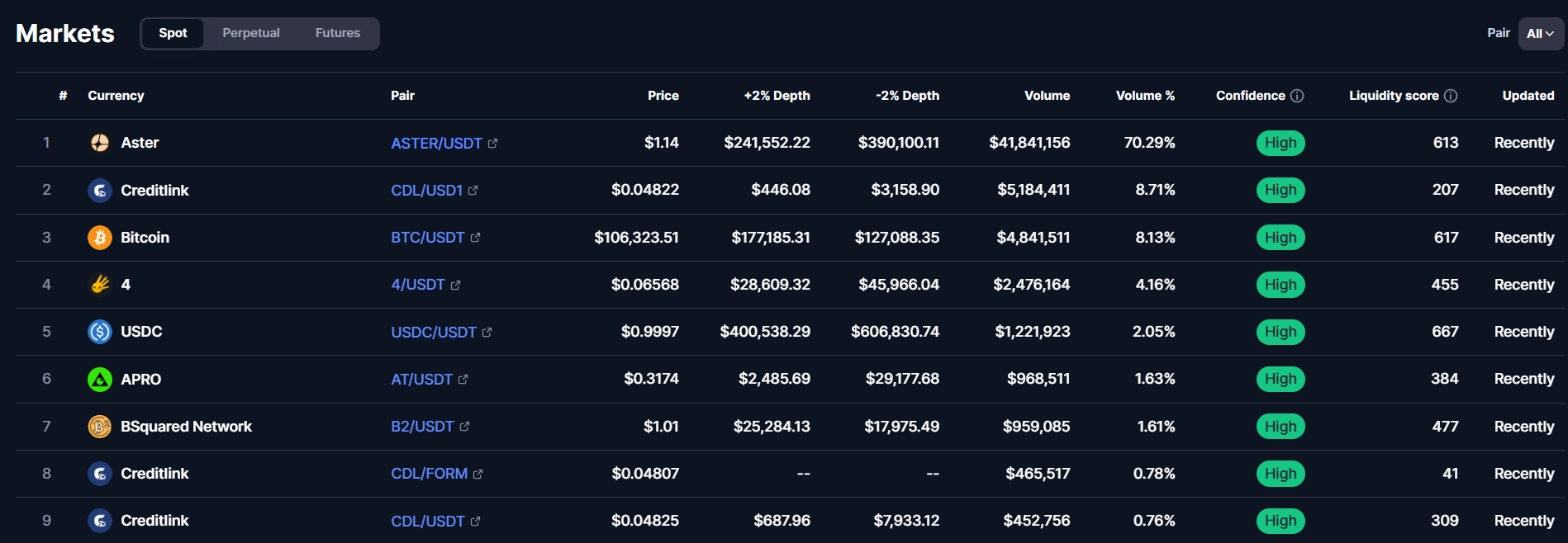در سطح نقدشوندگی، جفت معاملاتی ASTER/USDT بیشترین حجم را دارد و بخش عمده معاملات اسپات و پرپچوال روی همین جفت انجام می‌شود. این مسئله نشان می‌دهد که اکوسیستم هنوز به‌صورت گسترده چندجفتی نیست، اما نقدشوندگی هسته اصلی توکن قوی است و برای یک توکن تازه‌لیست‌شده امتیاز محسوب می‌شود.