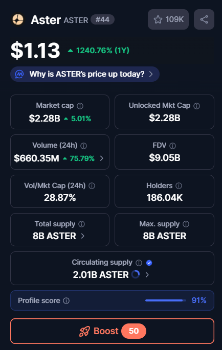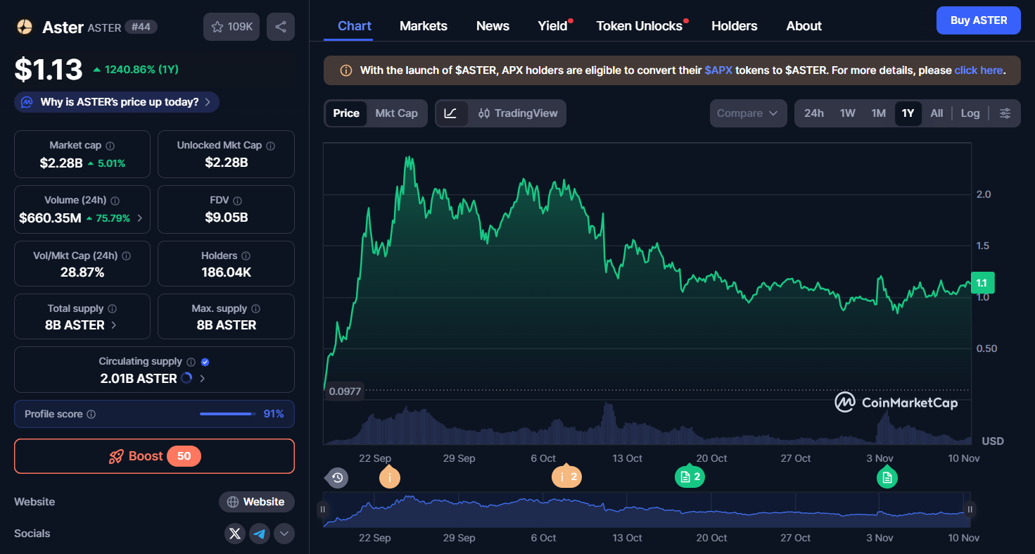 از نظر ارزش‌گذاری توکن، مارکت‌کپ فعلی Aster حدود ۴۴۰.۵۱ میلیون دلار و ارزش بازار کاملاً رقیق‌شده (FDV) نزدیک به ۱.۱۴ میلیارد دلار است. فاصله زیاد بین Market Cap و FDV به این معناست که بخش قابل توجهی از توکن‌ها هنوز قفل هستند یا به‌تدریج آزاد می‌شوند؛ بنابراین ریسک فشار فروش در دوره‌های آزادسازی آتی باید مورد توجه قرار گیرد.