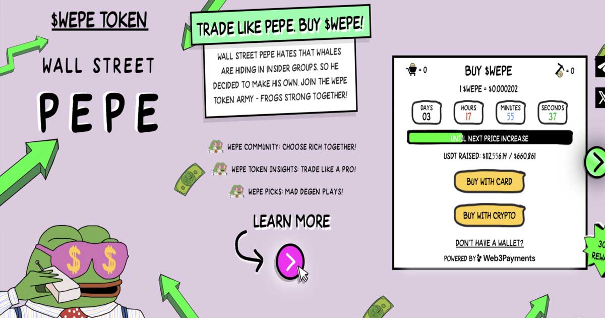 وال استریت پپه (Wallstreet Pepe-$WEPE) از جنبش شرطبندی وال استریت الهام گرفته شده است که هدف آن هموار کردن شرایط بازار برای سرمایهگذاران خرد و جلوگیری از دستکاری بازار توسط نهنگها بود. این میم کوین جدید که بر پایه عدالت و جامعه ساخته شده است، با ایجاد فضایی فراگیر، شتاب خوبی گرفته است.