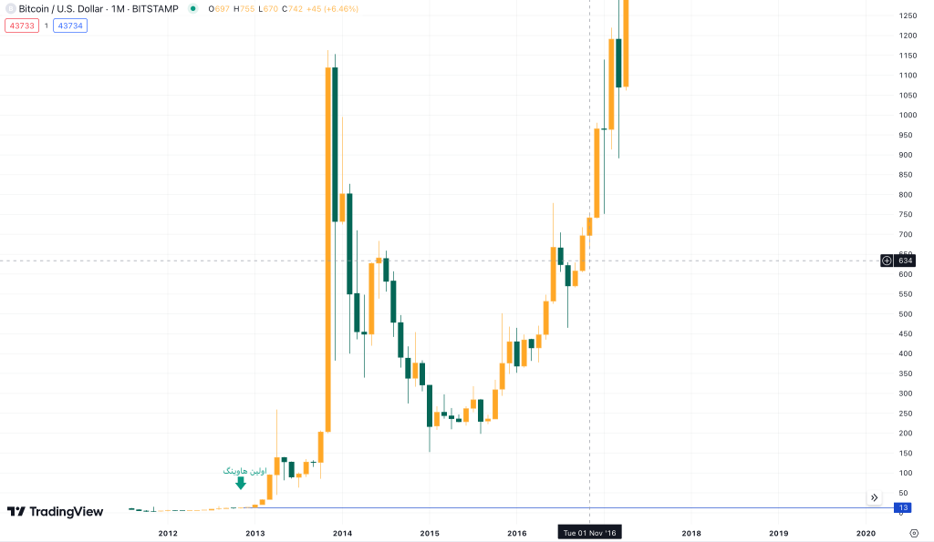 اولین رویداد هاوینگ بیت کوین در تاریخ 28 نوامبر 2012 در بلوک 210000 بیت کوین رخ داد. بالاترین قیمت بیت کوین در این زمان ۱۳ دلار بوده است.