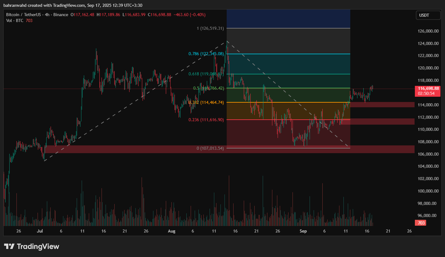 بیت کوین پس از اصلاح سنگین اواخر آگوست، دوباره در کانون توجه معاملهگران قرار گرفته است. نمودار چهارساعته نشان میدهد که قیمت در محدودهای حساس میان سطوح حمایتی و مقاومتی کلیدی در حال نوسان است. همزمان با نزدیکشدن به نشست مهم فدرال رزرو (FOMC)، بازار در وضعیت انتظار قرار دارد و واکنش بیتکوین به تصمیم نرخ بهره میتواند جهت حرکت بعدی را مشخص کند. در ادامه، مهمترین مقاومتها، حمایتها، وضعیت اندیکاتورها و سناریوهای محتمل برای کوتاهمدت بررسی میشوند.