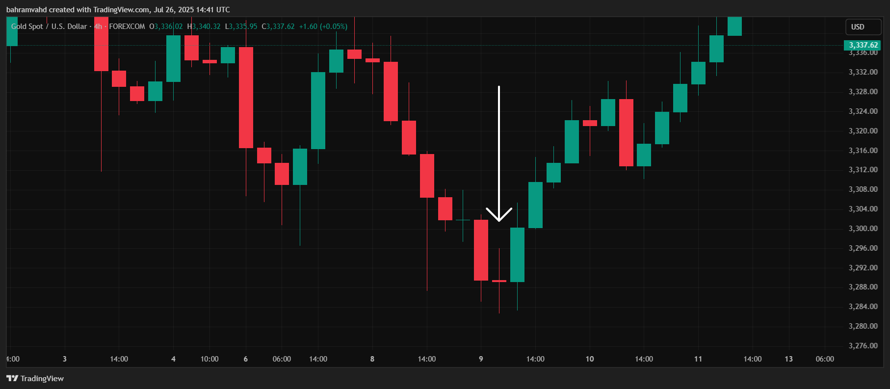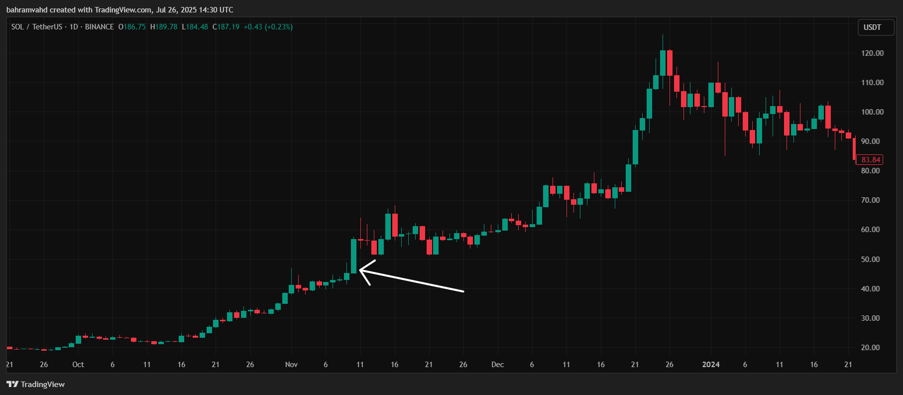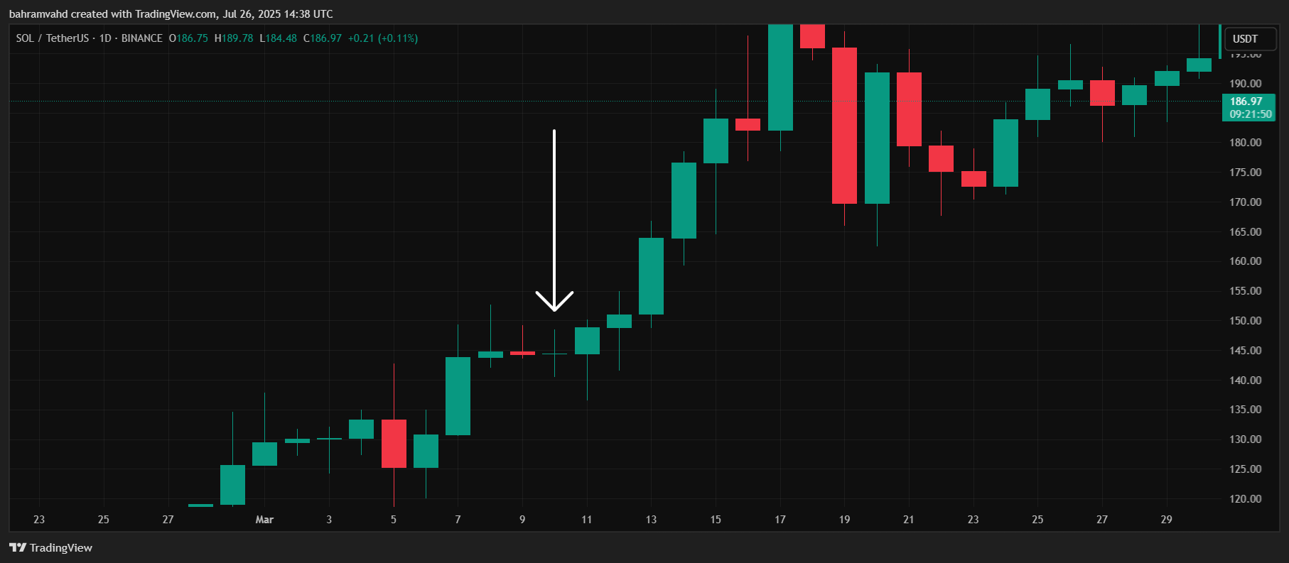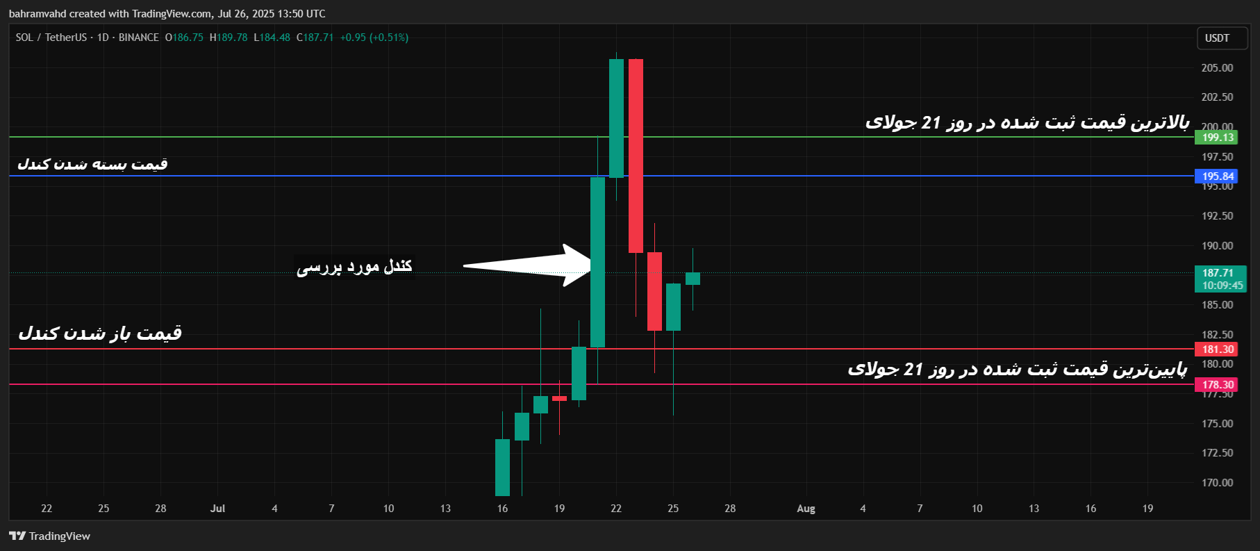 در تصویر بالا، نمودار روزانه جفتارز SOL/USDT را مشاهده میکنید. کندل مشخصشده با فلش سفید، کندل روز ۲۱ جولای است که در این مثال بهعنوان نمونه آموزشی بررسی شده است.