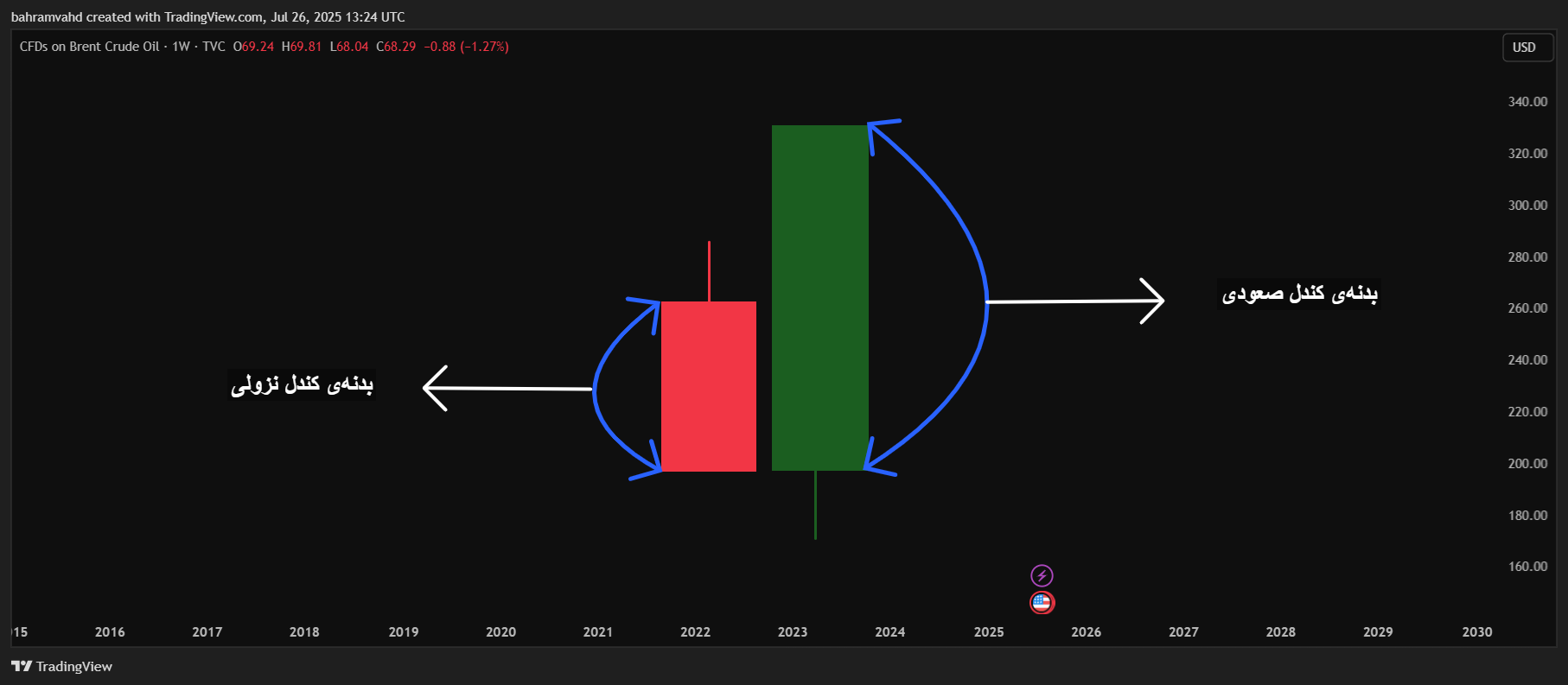 - ویژگیها: این کندل بدنهی بلندی دارد و تقریباً سایهای ندارد.