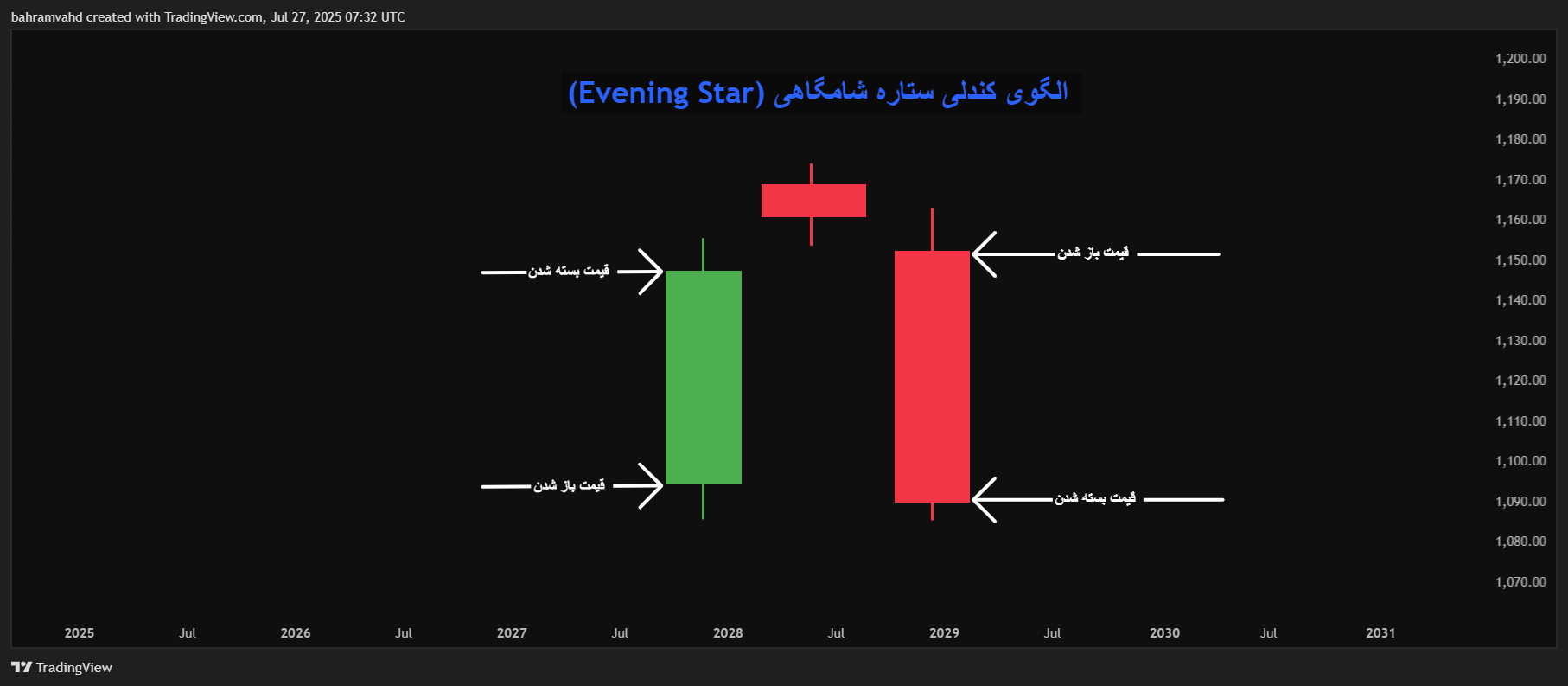 - ساختار: یک کندل صعودی قوی، یک کندل کوچک یا دوجی، یک کندل نزولی قوی