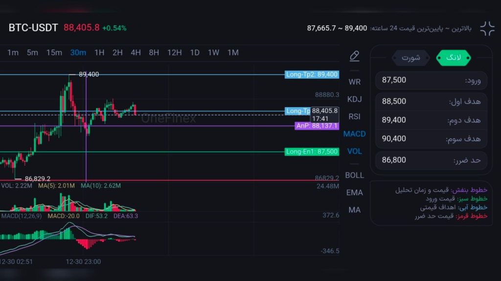 با وجود بازگشت اخیر، ساختار نزولی میانگینهای متحرک در تایمفریمهای بالاتر همچنان پابرجاست. ضعف مومنتوم در نمودارهای ساعتی و حضور مقاومتهای سنگین در محدوده 89.4K تا 90.4K دلار میتواند باعث رد قیمت و بازگشت به حمایتهای پایینتر شود.