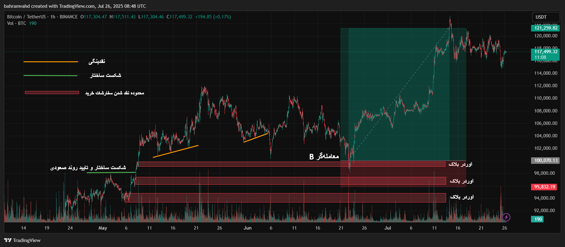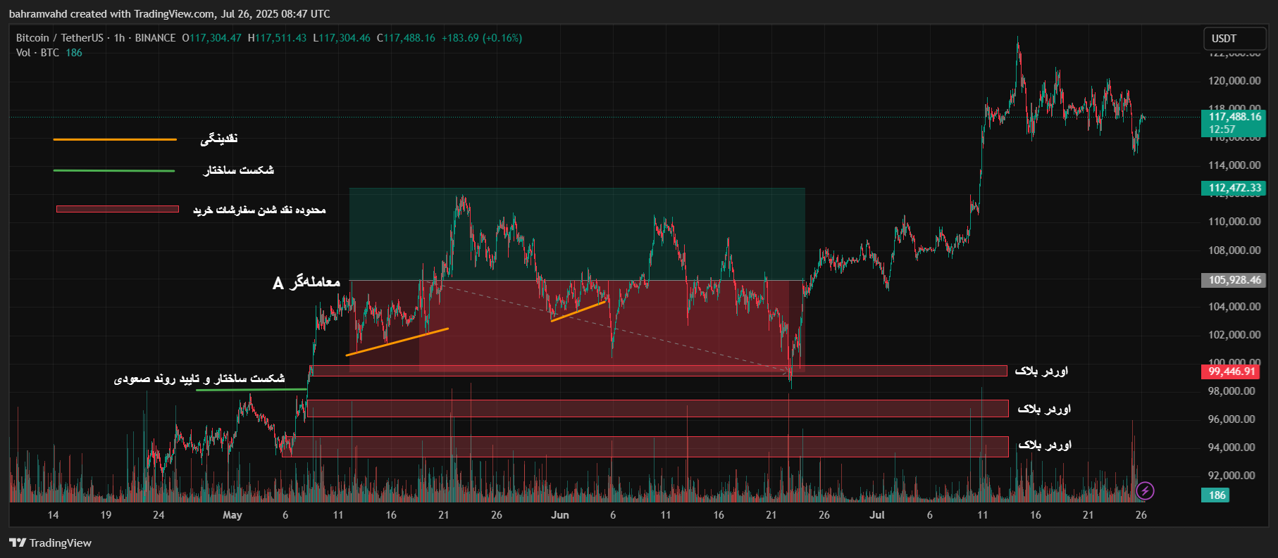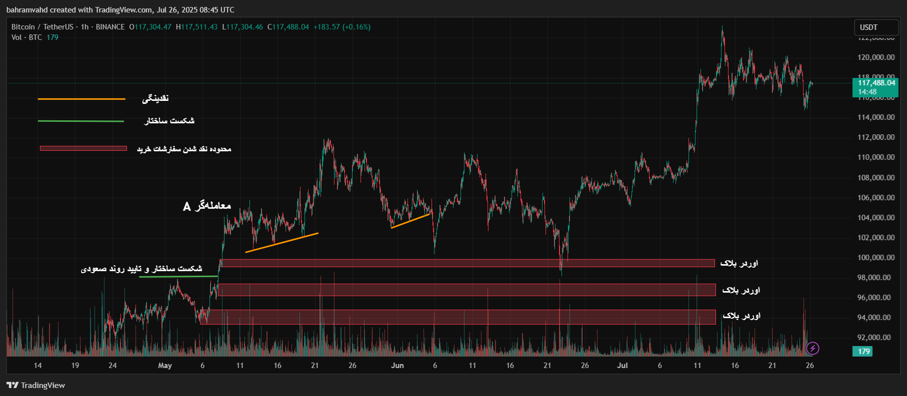 در بازارهایی که اهرم بالا رایج است و اطلاعات مربوط به سطوح لیکوئیدیشن و استاپلاس بسیاری از تریدرها روی دفتر سفارشات (Order Book) یا بهصورت تجمیعی روی بلاکچین قابل ردیابی است، بازیگران بزرگ میتوانند از این اطلاعات استفاده کنند. در ادامه به بررسی یک مثال ملموس از بیت کوین در تایم فریم 1 ساعته میپردازیم.