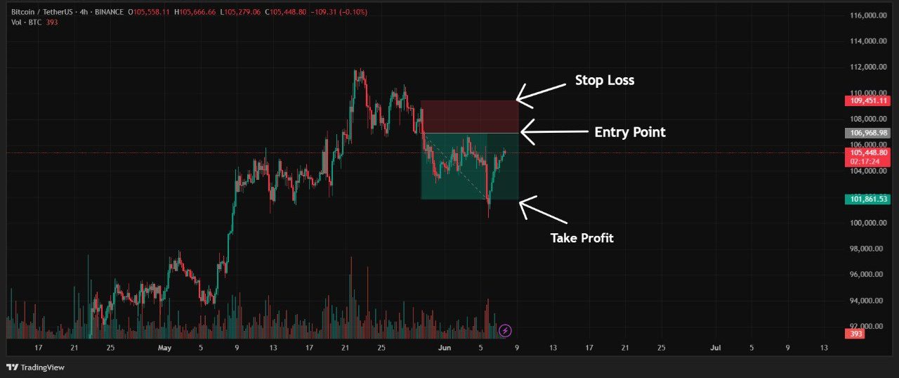 فرض کنید قیمت بیت کوین ۱۰۶,۹۶۸ دلار است. شما آن را قرض میگیرید و در همین قیمت میفروشید. اگر قیمت به ۱۰۱,۸۶۱ دلار برسد، میتوانید بیت کوین را با قیمت پایینتر بخرید و به قرضدهنده بازگردانید. سود شما برابر است با ۵,۲۹۰ دلار در هر واحد، این یعنی یک پوزیشن شورت موفق.