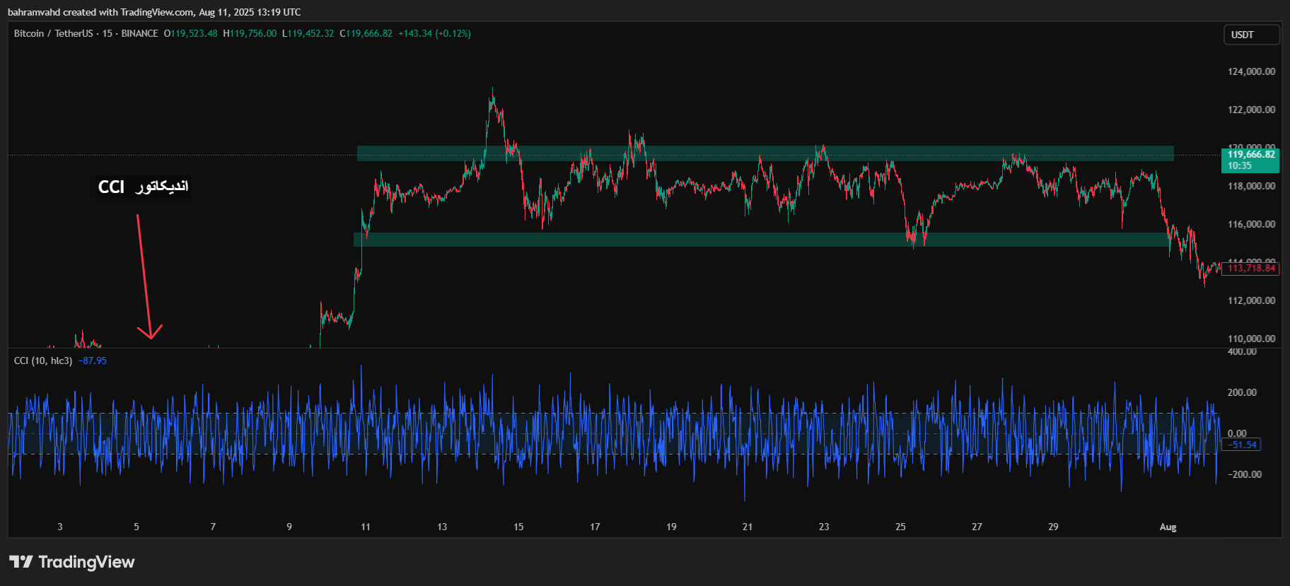 - CCI با دوره کوتاه (مثلاً 10): در شرایطی که بازار روندی ندارد، مدام بین مقادیر مثبت و منفی جابهجا میشود و باعث گیج شدن معاملهگر میگردد.