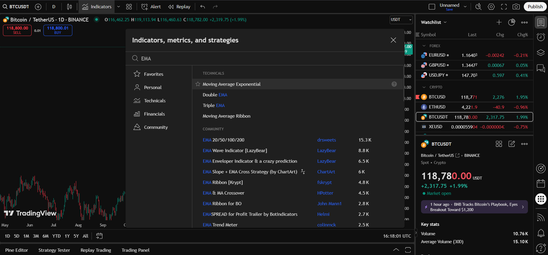 اندیکاتور EMA را روی نمودار اضافه کنید.