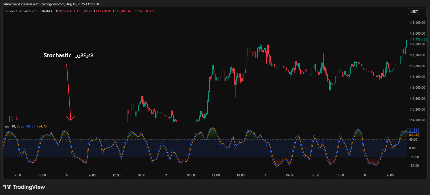 - Stochastic با تنظیمات بسیار حساس (مثلاً 5, 3, 3): در تایمفریمهای کوتاه به شدت تحت تاثیر حرکات کوچک قیمت قرار میگیرد.