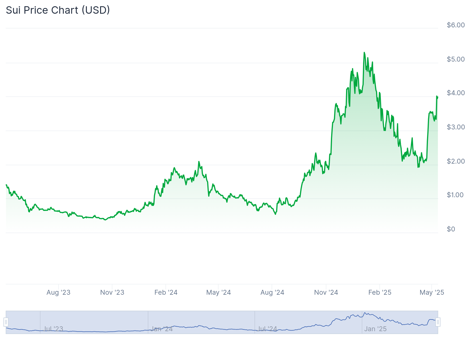 از زمان راهاندازی در ماه می ۲۰۲۳، Sui رشد قابل توجهی داشته و به یکی از بزرگترین بلاکچینهای لایه اول تبدیل شده است. قیمت توکن آن در ژانویه ۲۰۲۵ به بیشینهی ۵٫۳۵ دلار رسیده و ارزش بازار آن از ۱۵٫۹ میلیارد دلار فراتر رفته است.