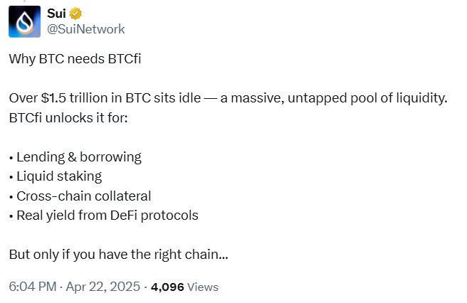 طبق دادههای رسمی شبکه، در حال حاضر بیش از ۱۰٪ از کل ارزش قفلشده (TVL) در اکوسیستم Sui به داراییهای مبتنی بر بیتکوین اختصاص دارد.