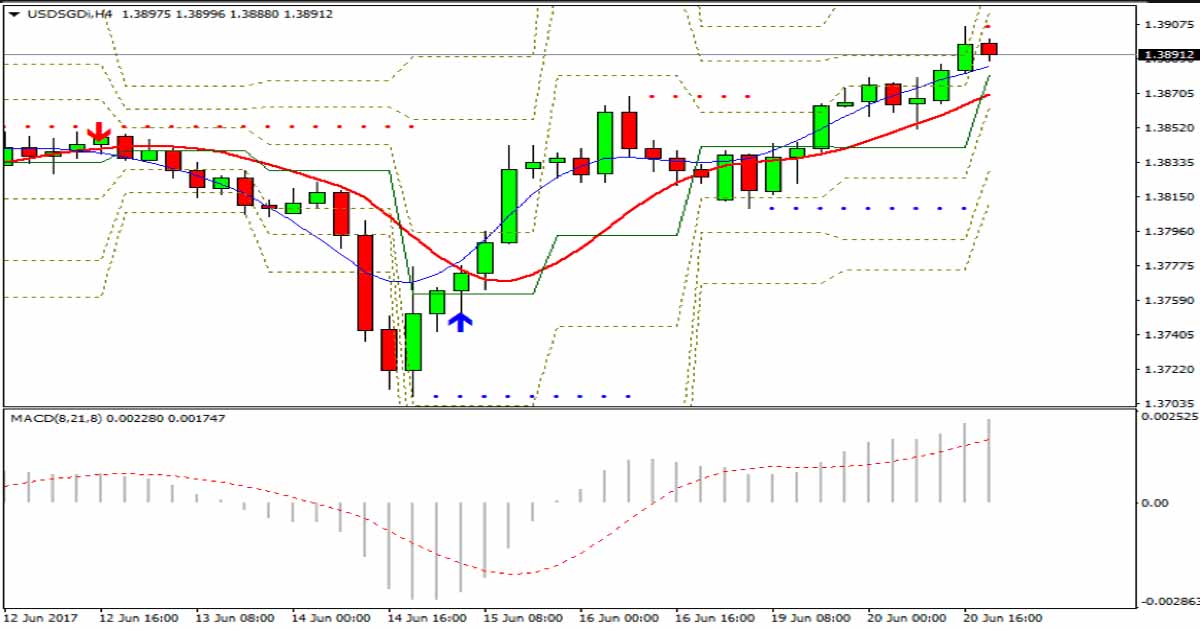 نمودار 4 ساعته USD/SGD در زیر مقدار یک اندیکاتور مومنتوم را نشان میدهد. اندیکاتور مومنتوم مکدی در یک پنجره جداگانه در زیر پنجره نمودار اصلی ظاهر میشود.