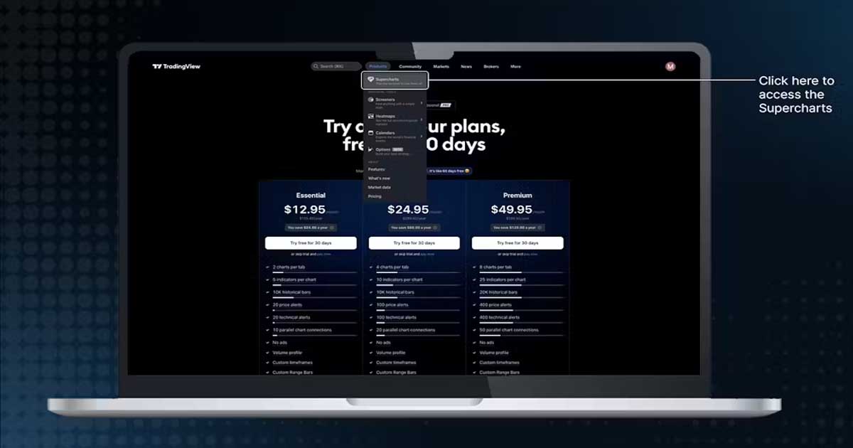 در این مقاله، ما فقط بر روی بخش “Supercharts” تمرکز میکنیم، که میتوانید با نگه داشتن نشانگر ماوس روی تب “Products” و کلیک بر روی “Supercharts” به آنها دسترسی پیدا کنید.