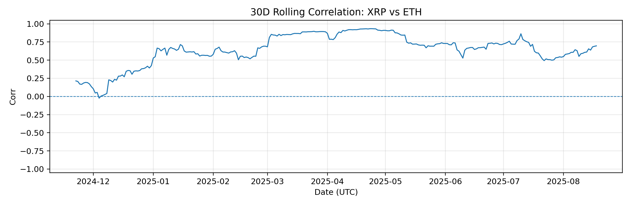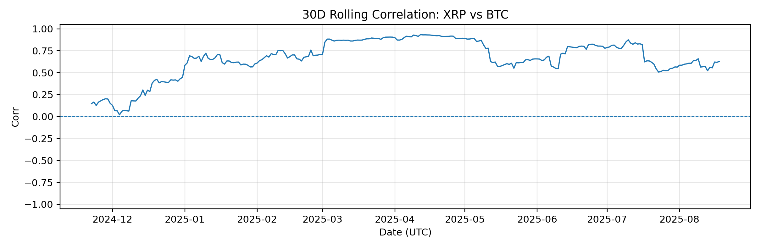 - در برخی بازهها، بهویژه در اوایل ۲۰۲۵، همبستگی XRP با بیتکوین به بالای +۰.۷ رسیده است. این نشان میدهد که در این دورهها، سرمایهگذاران رفتار مشابهی نسبت به هر دو دارایی داشتهاند.