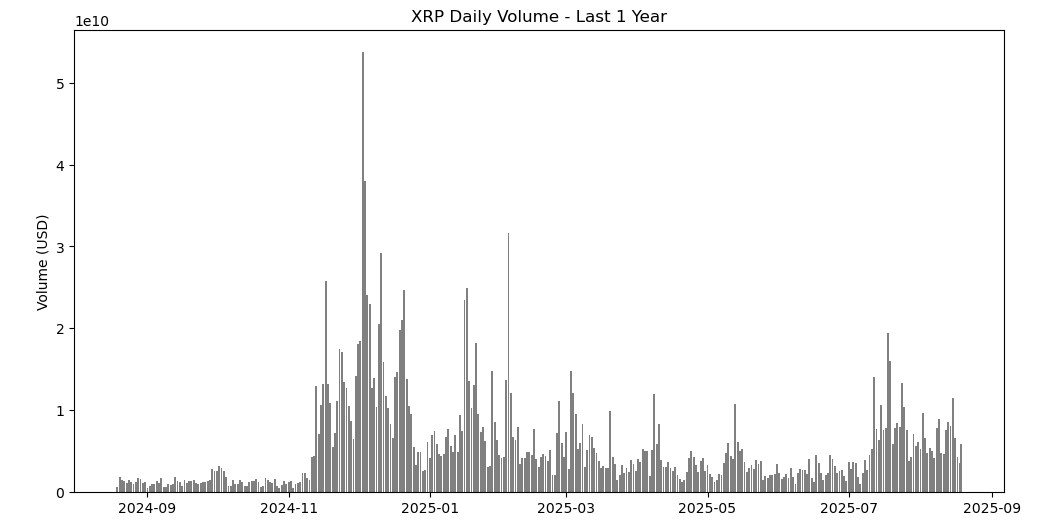 حجم معاملات روزانه یکی از شاخصهای کلیدی برای سنجش سلامت بازار و میزان نقدشوندگی یک دارایی است. بررسی نمودار حجم روزانه XRP طی یک سال گذشته نشان میدهد که این رمزارز در مقاطع مهمی با افزایش چشمگیر حجم مواجه شده است.