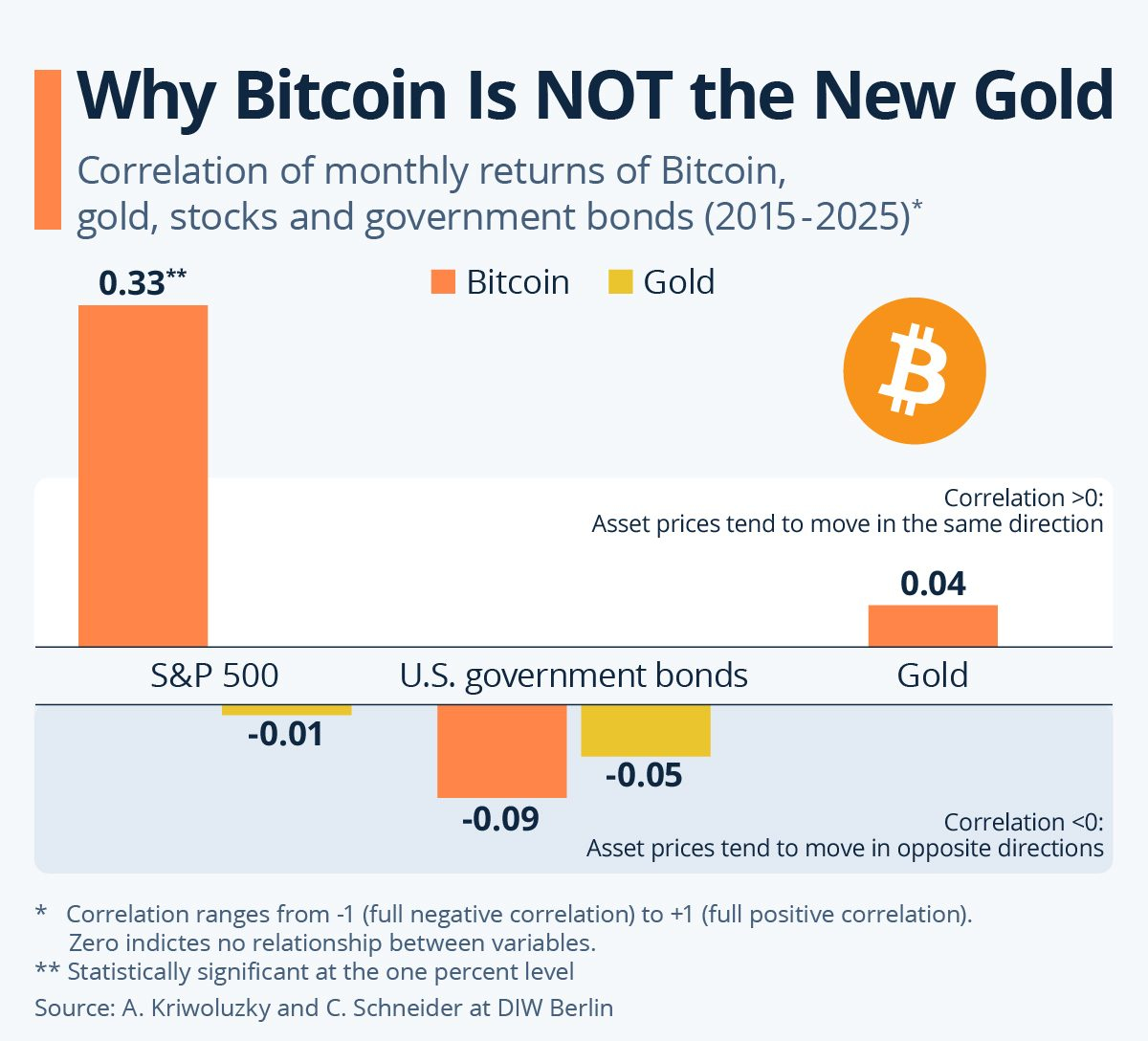 • بیت‌کوین = شاخص نقدینگی و دارایی ریسکی. عملکرد آن بیشتر شبیه سهام فناوری و دارایی‌های حساس به شرایط نقدینگی است تا طلا.