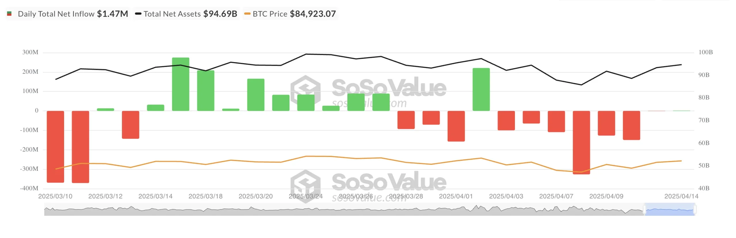 بر اساس دادههای منتشرشده، ETFهای بیتکوین در تاریخ ۱۴ آوریل مجموعاً ۱.۴۷ میلیون دلار سرمایه خالص جذب کردند. این اولین ورود سرمایه از تاریخ ۲ آوریل است و بهرغم آنکه رقم نسبتاً کوچکی محسوب میشود، پایان یک دوره ۷ روزه خروج سرمایه است که میتواند معنادار باشد.