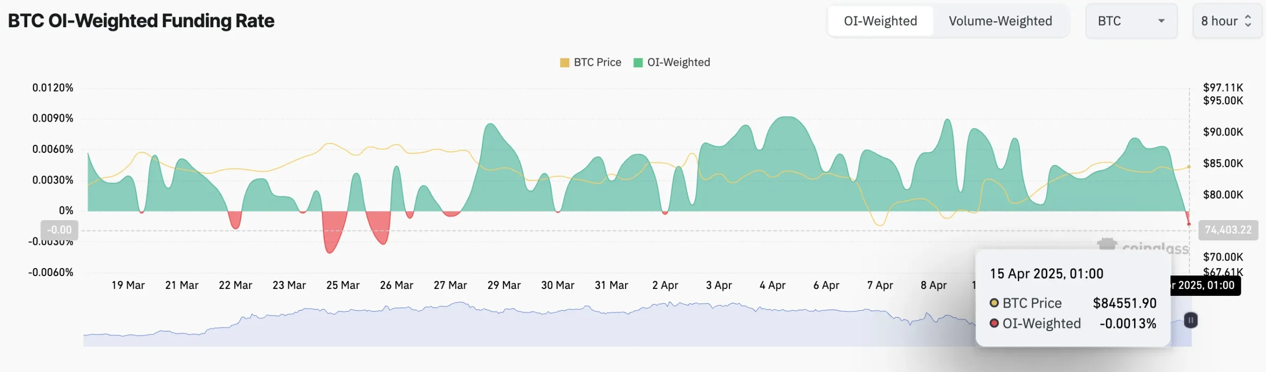 اما همهچیز هم خوشبینانه نیست. نرخ تأمین مالی (Funding Rate) بیتکوین برای اولین بار از ۲ آوریل منفی شده است. این بدان معناست که معاملهگران بیشتری برای حفظ پوزیشنهای فروش نسبت به خرید، حاضر به پرداخت کارمزد هستند. چنین پدیدهای معمولاً بهعنوان نشانهای از افزایش انتظارات نزولی تفسیر میشود.