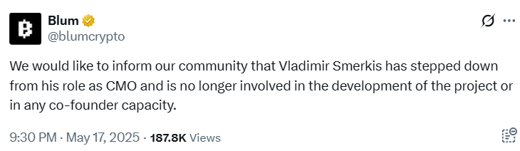 پروژه Blum از سوی Binance Labs و برنامه شتابدهنده «Most Valuable Builder» مورد حمایت قرار گرفت و توانست جامعهای فعال از کاربران جذب کند. اما تاخیرهای مکرر در برگزاری ایردراپ و فصلهای جدید بازی باعث ایجاد تردیدهایی در میان کاربران شده بود؛ موضوعی که پس از بازداشت اسمِرکیس تشدید شد.