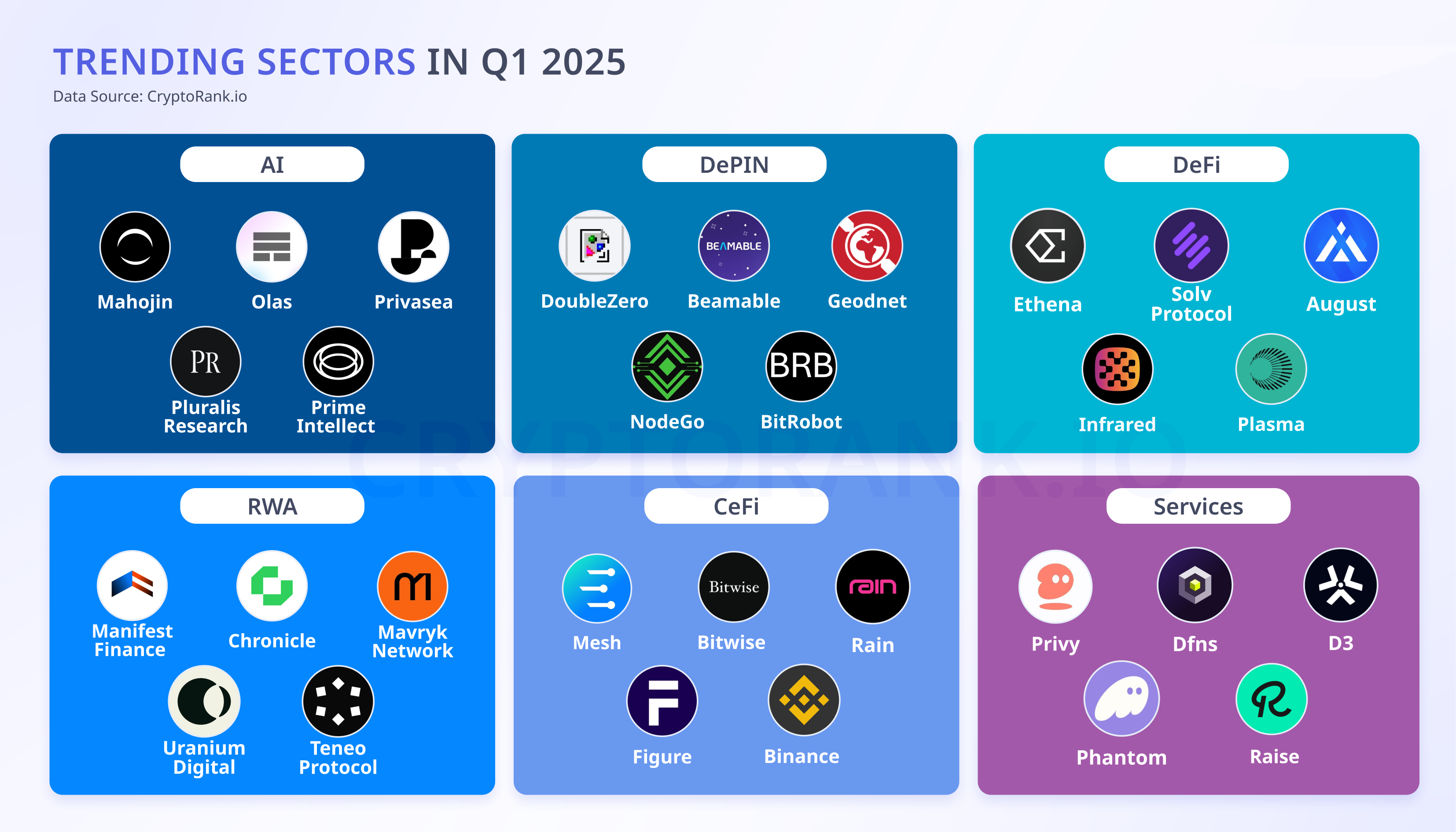 سرمایه بیشتر به سمت بخشهایی با کاربردهای اثباتشده و پتانسیل درآمدزایی مانند CeFi، زیرساختهای بلاکچین و خدمات بلاکچینی جریان یافت. در عین حال، حوزههای نوظهور مانند هوش مصنوعی (AI)، زیرساختهای فیزیکی غیرمتمرکز (DePIN) و داراییهای دنیای واقعی (RWA) نیز توجه زیادی را از سوی سرمایهگذاران به خود جلب کردند.