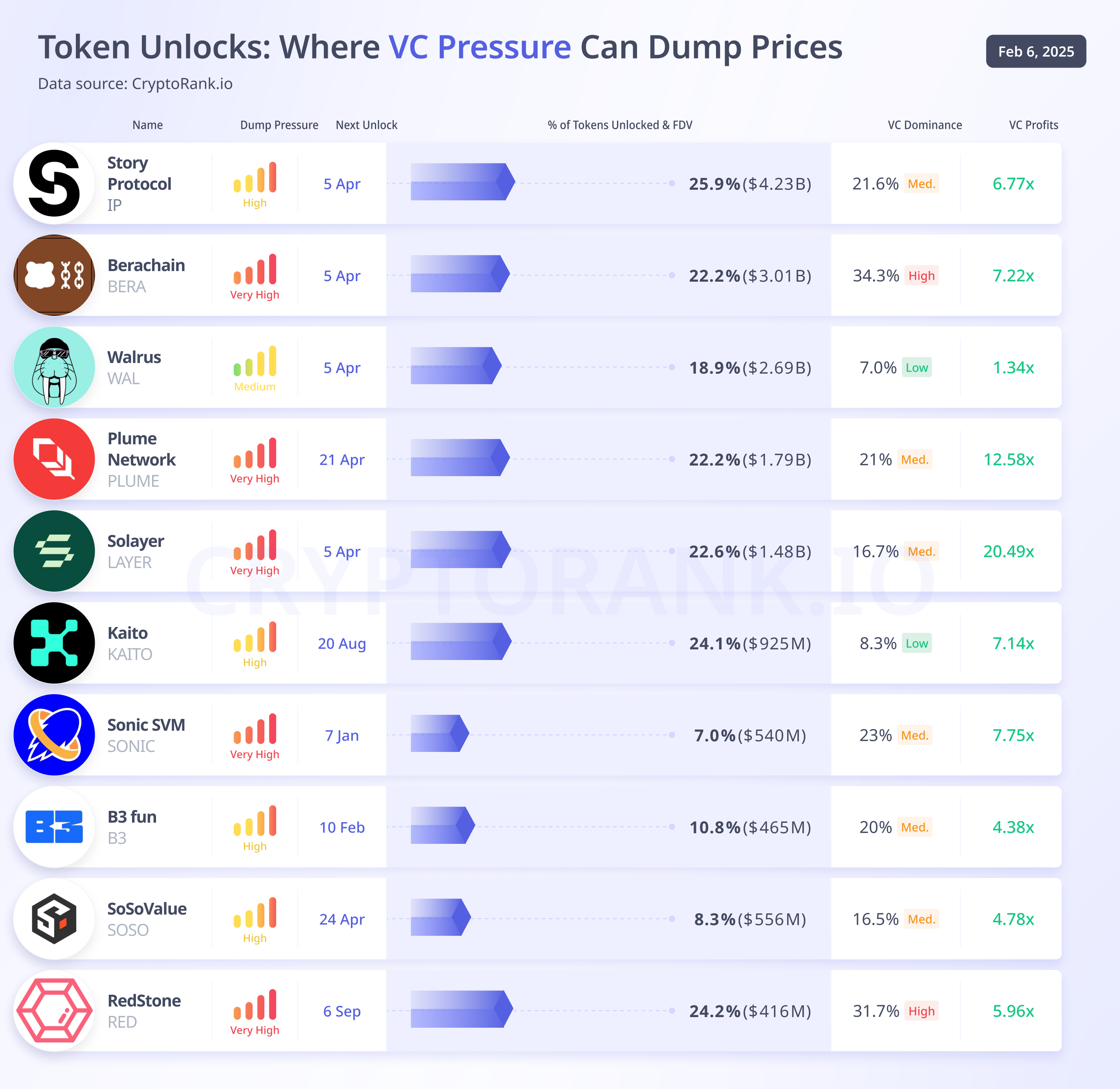 در سهماهه اول ۲۰۲۵، چندین توکن بزرگ با پشتیبانی سرمایهگذاران خطرپذیر (VC-backed) وارد بازار شدند که مجموعا نزدیک به ۲۰ میلیارد دلار ارزش قفلشده (to-be-unlocked) را به بازار معرفی کردند. این عرضهها نشاندهنده موج قابلتوجهی از توزیع توکنها هستند که انتظار میرود بر دینامیک بازار در فصلهای آینده تأثیرگذار باشند. سرمایهگذاران خرد باید بهشدت برنامههای آنلاک (unlock schedules) پروژههایی مانند: برا چین، استوری پروتکل، پلوم نتورک نظارت داشته باشند؛ چرا که این پروژهها نسبت شناوری (float ratio) بسیار پایینی دارند.