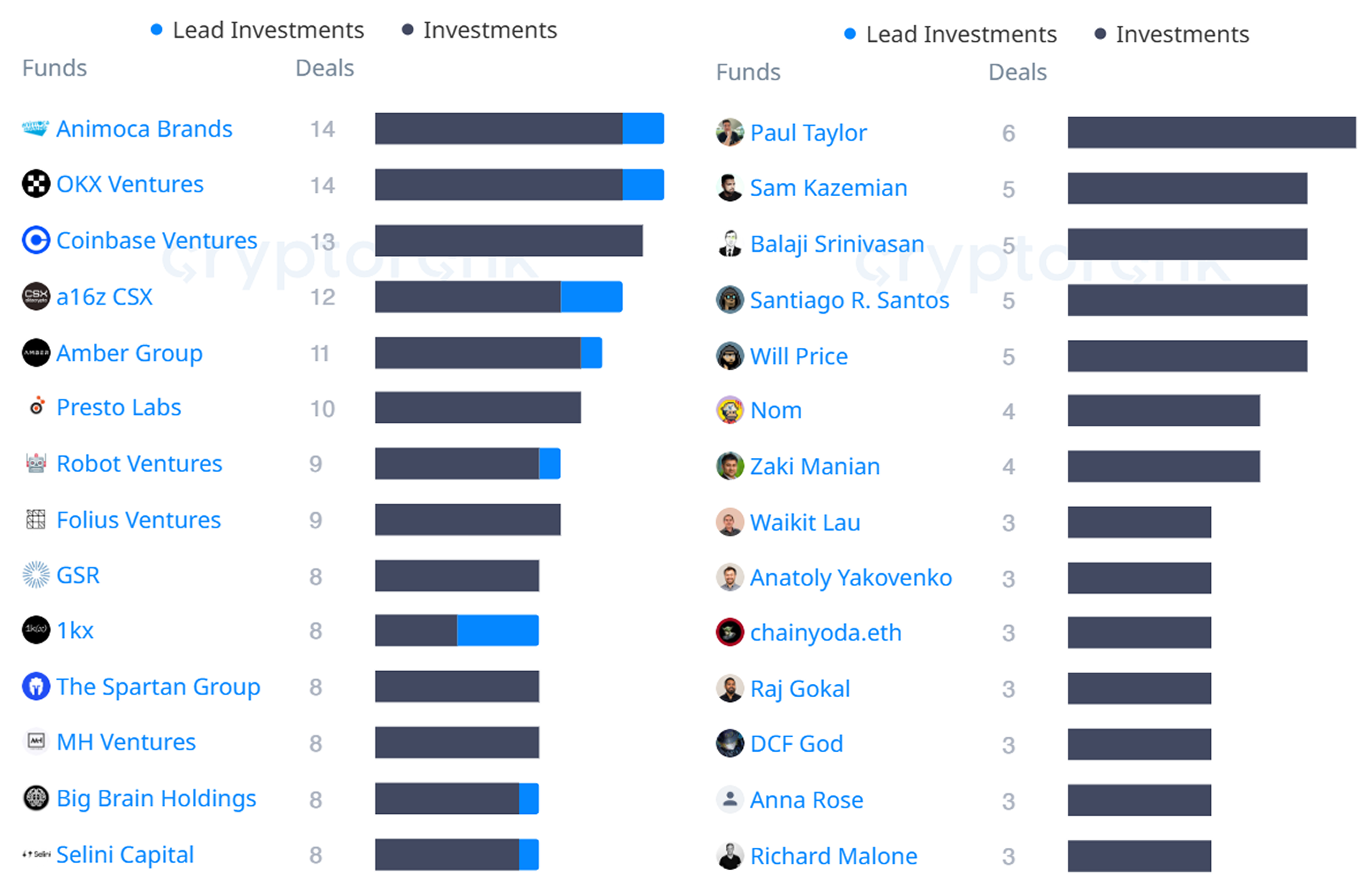در سهماهه اول ۲۰۲۵، دو شرکت Animoca Brands و OKX Ventures بهعنوان فعالترین صندوقهای سرمایهگذاری خطرپذیر در حوزه کریپتو ظاهر شدند. تمرکز اصلی هر دو صندوق بر معاملات کوچک و متوسط بوده است؛ نشانهای از حمایت هدفمند از پروژههای نوپا با پتانسیل رشد.