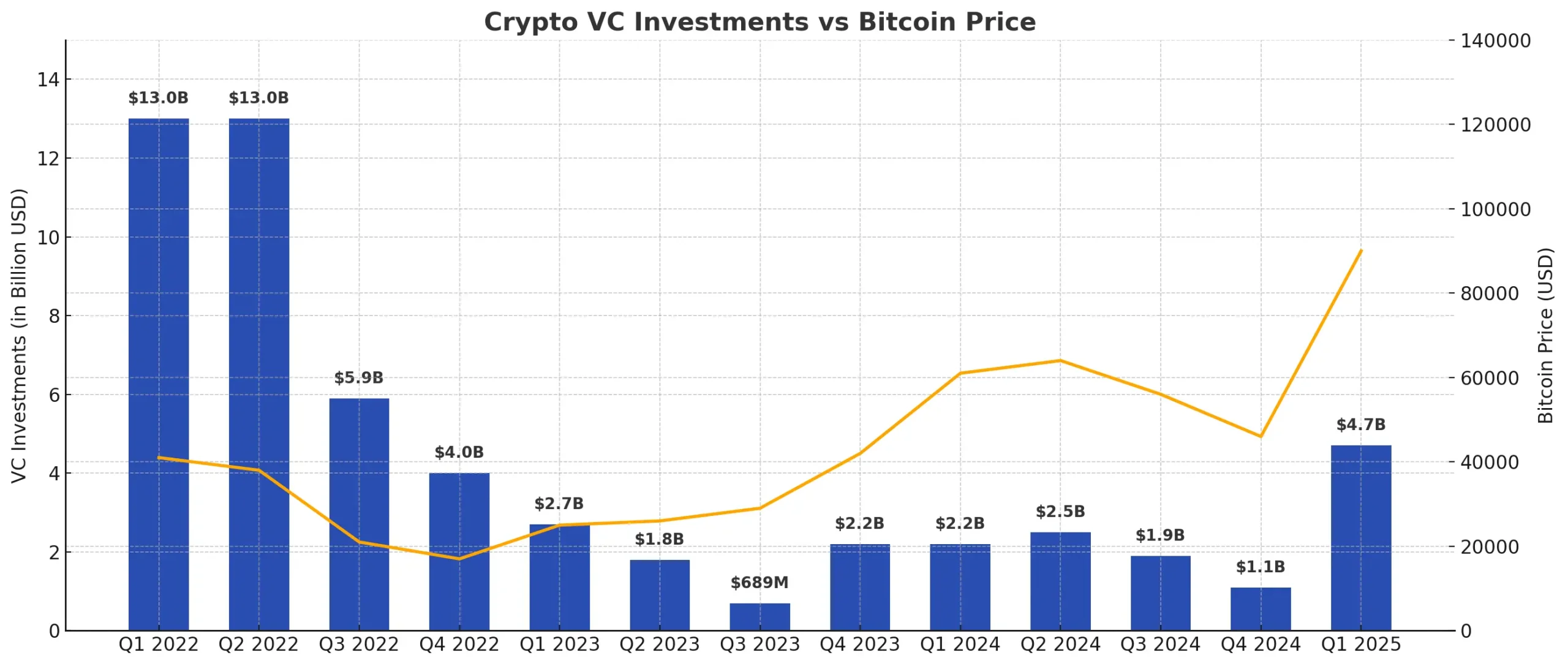 در مقایسه با چرخههای قبلی، رابطه مستقیم میان نوسانات قیمت بیتکوین و فعالیتهای سرمایهگذاری خطرپذیر (VC) در بازار کریپتو کمرنگتر شده است. در حال حاضر، دادهها نشان میدهد که سرمایهگذاریهای VC با یک تا دو فصل تأخیر نسبت به تغییرات قیمتی بیتکوین انجام میشود.