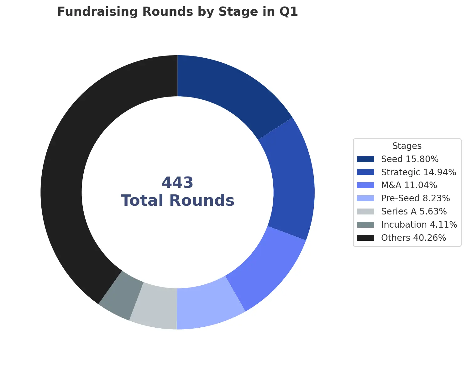 با وجود افزایش سرمایه کل جذبشده، تعداد دفعات جذب سرمایه (investment rounds) در سهماهه اول سال ۲۰۲۵ اندکی کاهش یافته است. از این منظر، میتوان گفت بازار نسبت به سال ۲۰۲۳ در وضعیت سالمتری قرار دارد، هرچند که در مقایسه با فصلهای اول و دوم سال ۲۰۲۴، تعداد معاملات انجامشده کاهش داشته است.