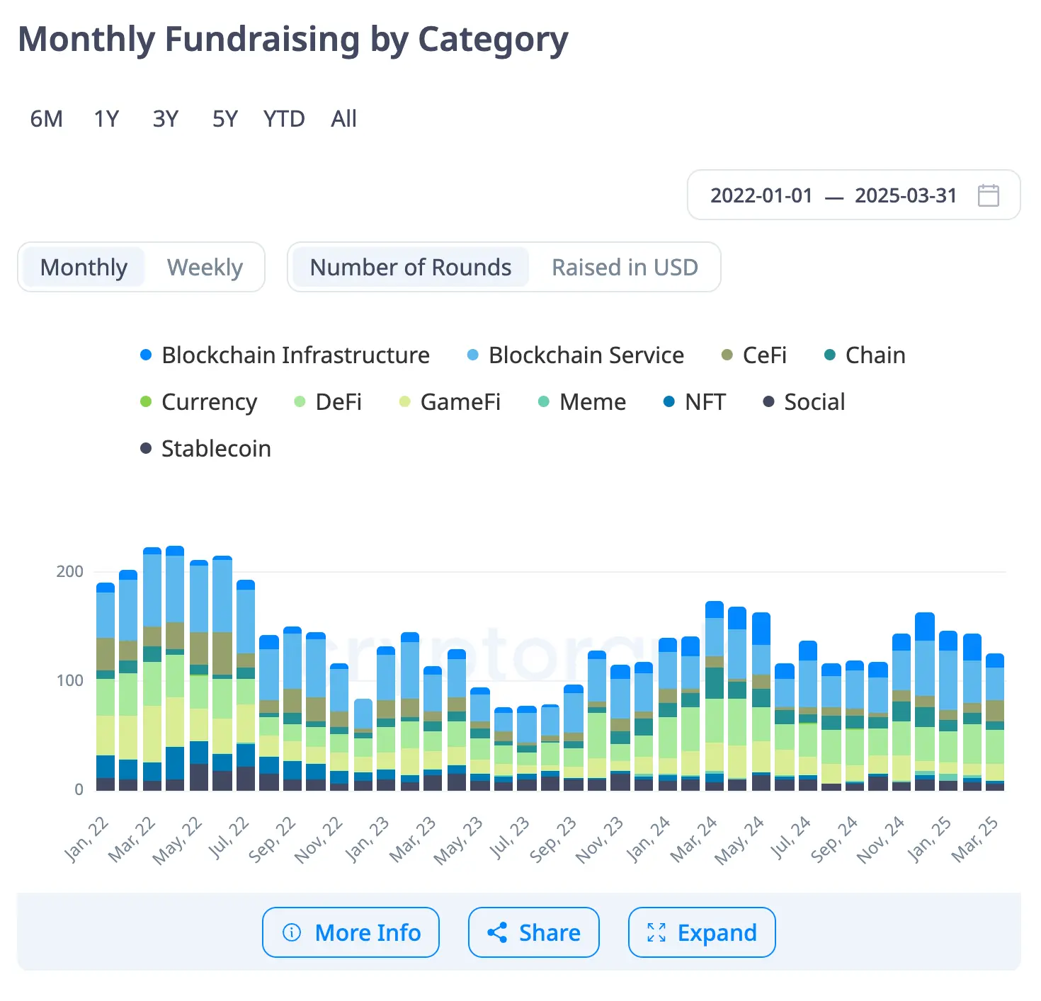 در مقابل بخشهایی مانند CeFi و زیرساخت، پروژه های دیفای (DeFi) در سهماهه اول ۲۰۲۵ در میان برترین دستهها از نظر تعداد معاملات بستهشده قرار گرفتند. با وجود این، میزان سرمایه جذبشده در این حوزه نسبتاً محدود باقی ماند. این موضوع نشان میدهد که علاقه سرمایهگذاران به حوزه امور مالی غیرمتمرکز همچنان پابرجاست، اما اندازه معاملات کوچکتر و ارزشگذاریهای پایینتر، بازتابی از شرایط کلی سرد بازار کریپتو و کاهش هیجان پیرامون دیفای است.