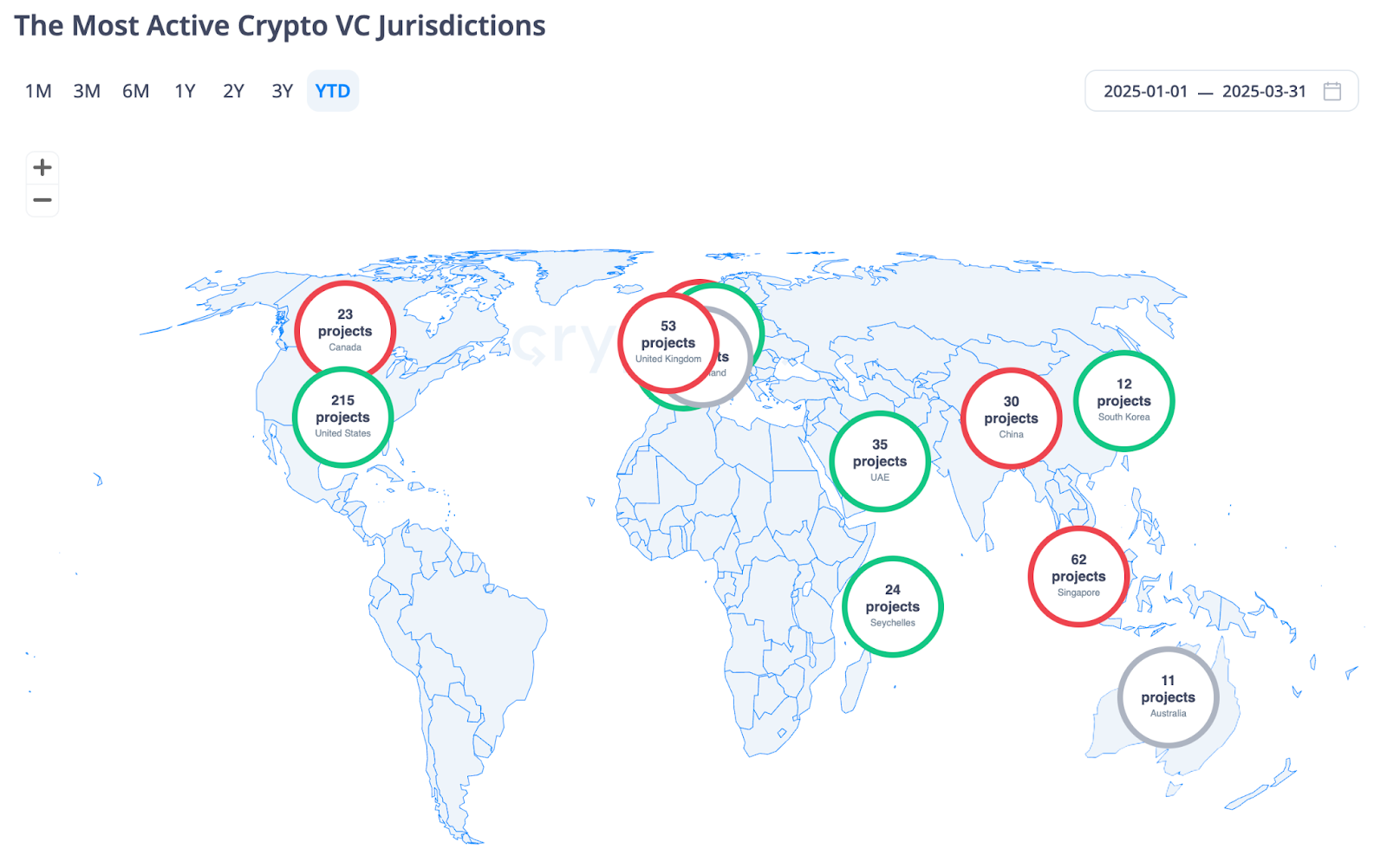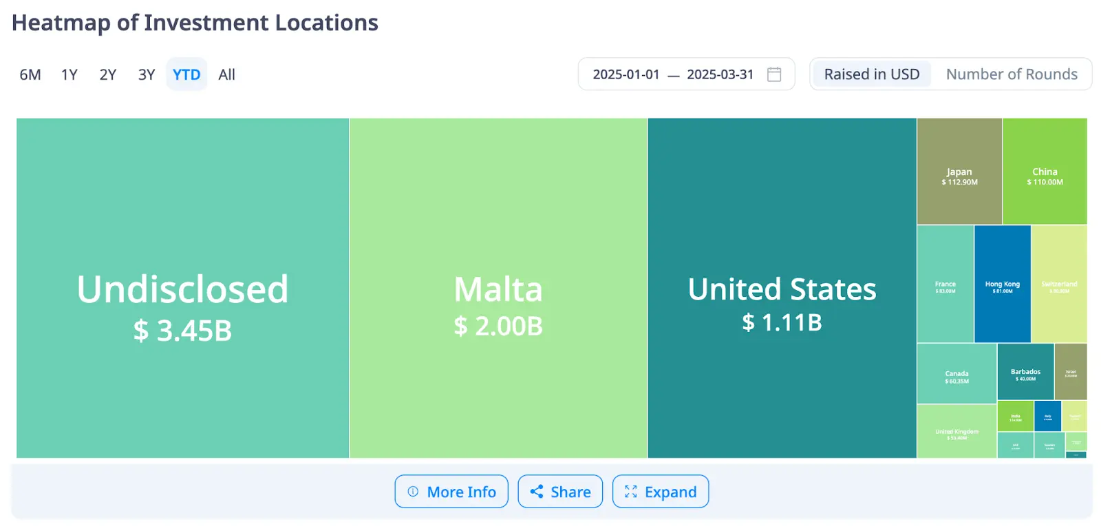 در پی معامله ۲ میلیارد دلاری بایننس، کشور مالت در سهماهه اول ۲۰۲۵ بهطور موقت صدرنشین جذب سرمایه در میان حوزههای قضایی (jurisdictions) شد. با این حال، ایالات متحده همچنان بازیگر اصلی و غالب این حوزه باقی ماند؛ جایی که اکثریت پروژههای سرمایهپذیر و سرمایهگذاریهای جسورانه در آن انجام میشود.