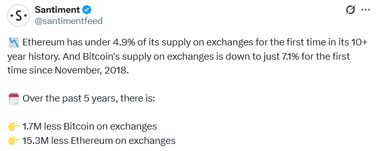 براساس گزارش Santiment، موجودی بیتکوین در صرافیها به ۷.۱٪ رسیده که پایینترین سطح از نوامبر ۲۰۱۸ تاکنون محسوب میشود. در طول پنج سال گذشته، حدود ۱.۷ میلیون واحد بیتکوین از صرافیها خارج شدهاند. همین روند برای اتریوم نیز دیده میشود؛ بهطوریکه برای اولین بار در بیش از ۱۰ سال گذشته، سهم اتریوم در صرافیها به کمتر از ۴.۹٪ از کل عرضه کاهش یافته است. در این مدت، حدود ۱۵.۳ میلیون واحد اتریوم از پلتفرمهای معاملاتی بیرون کشیده شدهاند.