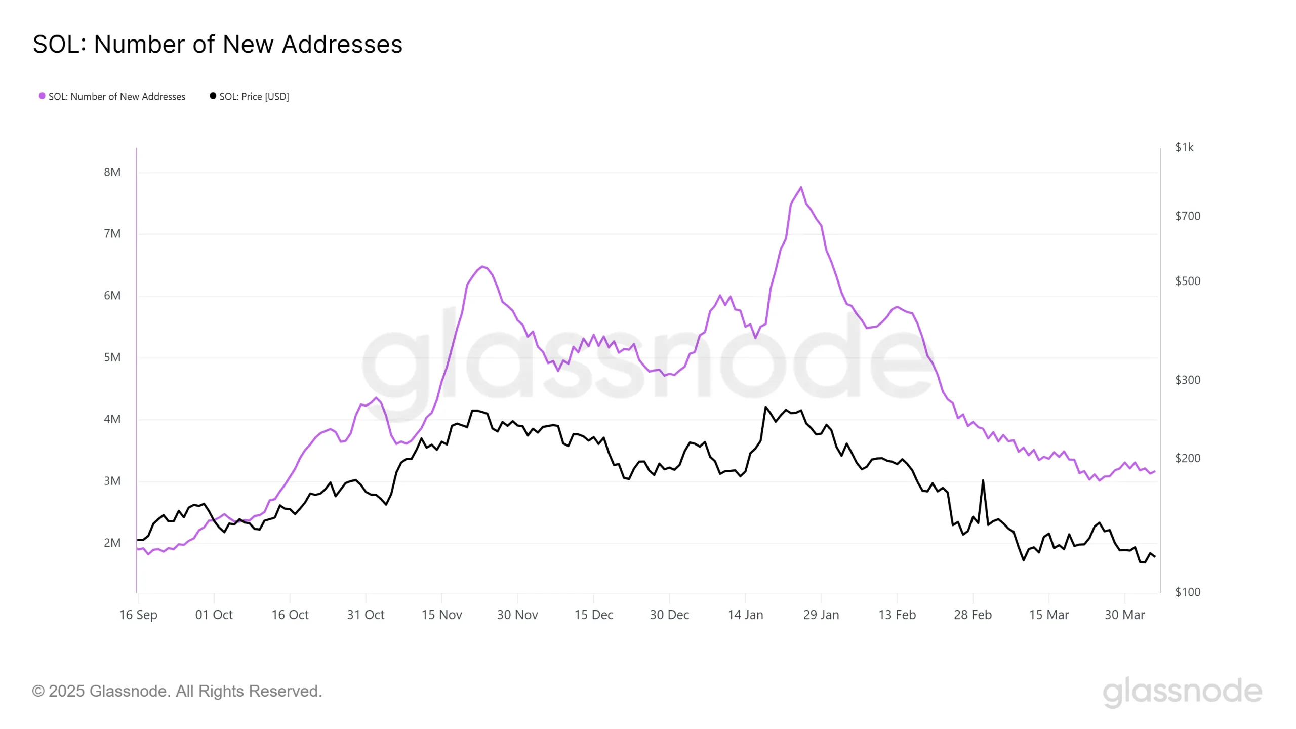 بررسیها نشان میدهد که فعالیت آدرسهای جدید در شبکه سولانا به کمترین میزان طی شش ماه گذشته رسیده است. این کاهش به وضوح نشان میدهد که علاقه سرمایهگذاران خرد برای ورود به بازار سولانا کاهش یافته و نوعی بیاعتمادی یا احتیاط در میان کاربران تازهوارد مشاهده میشود. آخرین باری که چنین سطح پایینی از فعالیت آدرسهای جدید دیده شده بود، به ماه اکتبر بازمیگردد.