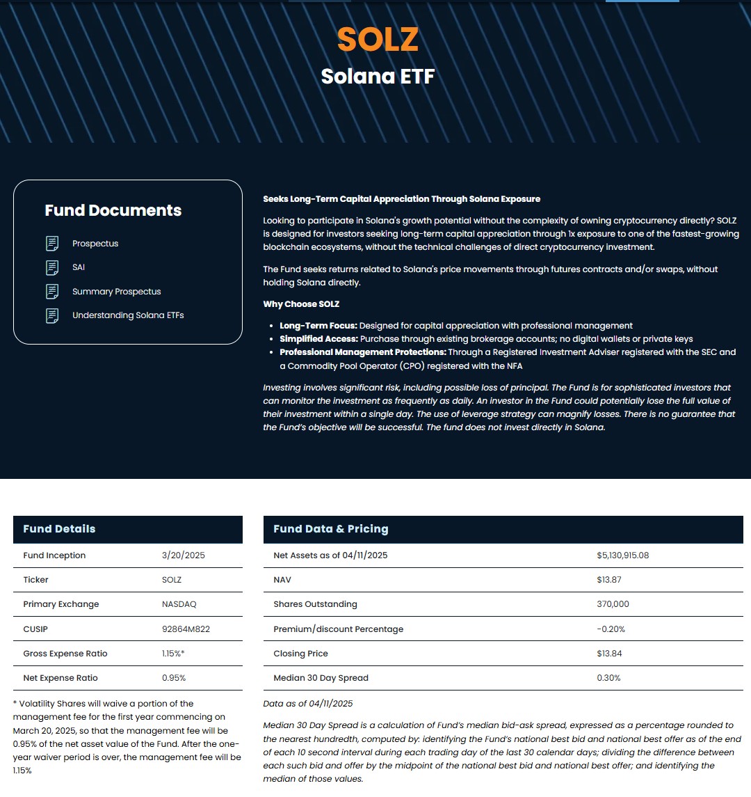 در مارس ۲۰۲۵، شرکت Volatility Shares اولین ETFهای فیوچرز سولانا را در آمریکا راهاندازی کرد. با این حال، صندوق SOLZ که عملکرد سولانا را از طریق مشتقات مالی دنبال میکند، تاکنون تنها حدود ۵ میلیون دلار دارایی خالص جذب کرده است—رقمی ناچیز در مقایسه با ETFهای بیتکوین یا اتریوم. بالچوناس در اینباره نوشت: