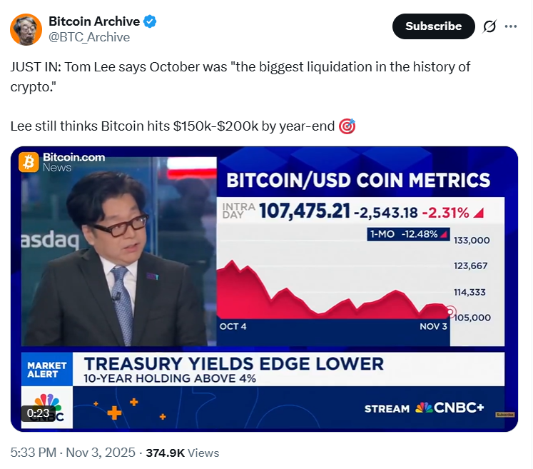 در پی سقوط گسترده بازار رمزارزها در ماه اکتبر، «تام لی» (Tom Lee)، بنیانگذار شرکت Fundstrat Global Advisors، اعلام کرد که این ماه شاهد بزرگترین لیکوئیدیشن در تاریخ کریپتو بوده است. او در گفتوگویی با CNBC گفت این اتفاق بزرگترین پاکسازی بازار در پنج سال اخیر است و با وجود فشار فروش شدید، همچنان انتظار دارد بیتکوین تا پایان سال به محدوده ۱۵۰ تا ۲۰۰ هزار دلار برسد.