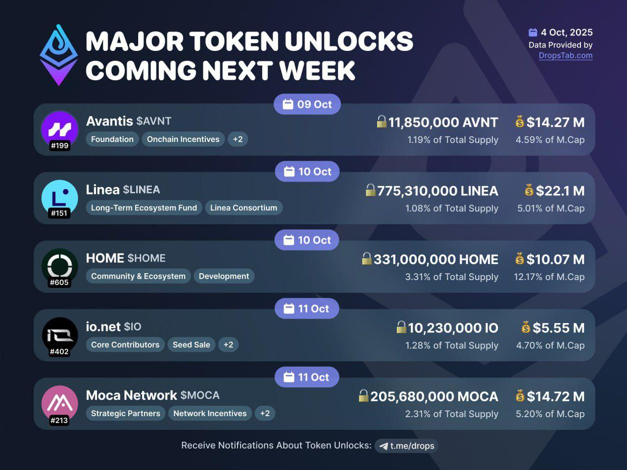 بر اساس دادههای منتشر شده، بازار رمز ارزها در هفته آینده شاهد چند رویداد مهم در حوزه آزادسازی توکنها خواهد بود. طبق این گزارش، پنج پروژهی مطرح شامل آوانتیس (AVNT)، لینیا (LINEA)، هوم (HOME)، آیاونت (IO) و موکا نتورک (MOCA) مجموعاً بیش از ۶۶ میلیون دلار توکن را آزاد خواهند کرد.