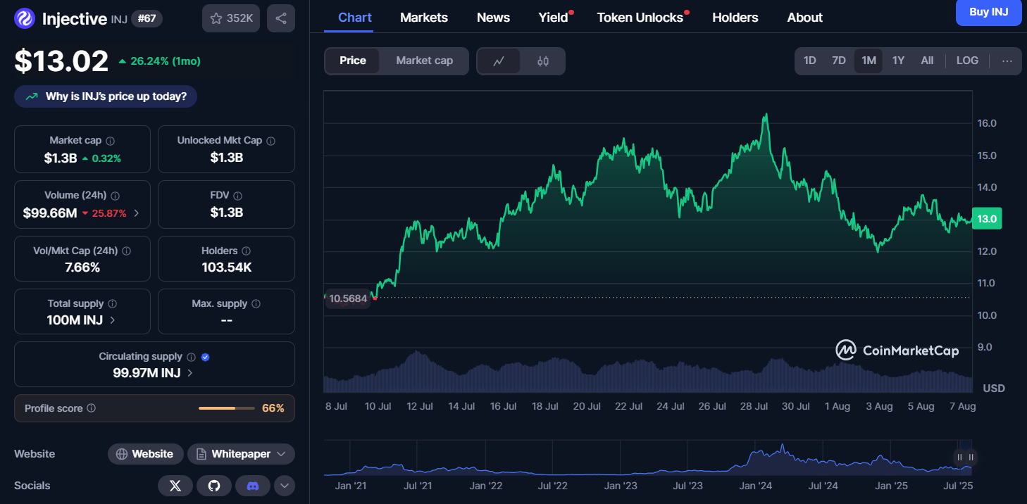 اینجکتیو (INJ) در آگوست ۲۰۲۵ رشد ۳۳ درصدی داشته و توانسته به سقف قیمتی جدیدی در سال جاری دست یابد. این توکن به دلیل تمرکز بر ترید غیرمتمرکز و ابزارهای مشتقه در بستر بلاکچین، در بین کاربران حرفهای و فعالان بازار محبوبیت پیدا کرده است.