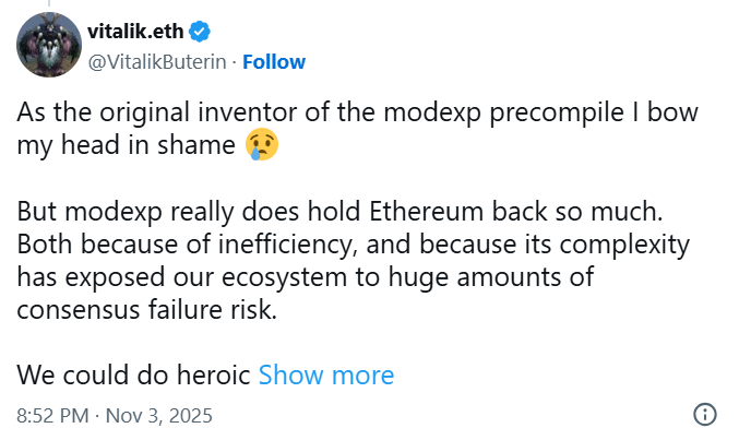 بوترین میگوید modexp تا ۵۰ برابر سنگینتر از عملیاتهای معمولی است و همین موضوع سرعت تولید اثباتها را پایین میآورد؛ در نتیجه رولآپها و سیستمهای مقیاسپذیری اتریوم به خوبی نمیتوانند رشد کنند. او حتی گفت که بابت طراحی این ویژگی «شرمنده است» و حالا معتقد است باید حذف یا با نسخه سادهتری جایگزین شود، حتی اگر اجرای آن گرانتر شود.